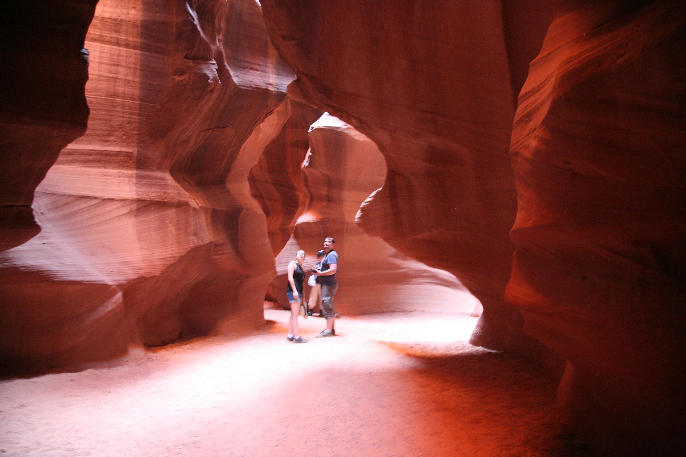 Als letztes folgte das Highlight des Tages (zumindest für mich) – der Upper Antelope Canyon. Eine schmale einige hundert Meter lange Schlucht durch einen rötlichen Sandstein. Es empfiehlt sich, die Touren vorab zu buchen, da das Kontingent vor Ort sehr begrenzt (und i.d.R. teurer) ist. Wir fuhren zuerst zum Upper Antelope Canyon und erkundigten uns da nach den Modalitäten. Eine Führung sollte 48$ kosten. Aber es gab eine knapp 1,5 stündige Wartezeit. Sowohl der Preis als auch die Wartezeit schreckte uns ein wenig ab. Wir fuhren daher erst einmal weiter zum Lower Antelope Canyon. Hier gab es vor Ort 2 Anbieter für Touren. Die Preise hier waren mit 25$ bzw. 33$ etwas günstiger. Der Anbieter der 25$ Tour hatte allerdings eine Wartezeit von über 2 Stunden und der andere Anbieter war für diesen Tag bereits komplett ausgebucht. Zu den Kosten für die Tour wären noch extra Gebühren für eine Fotoerlaubnis gekommen (46$).