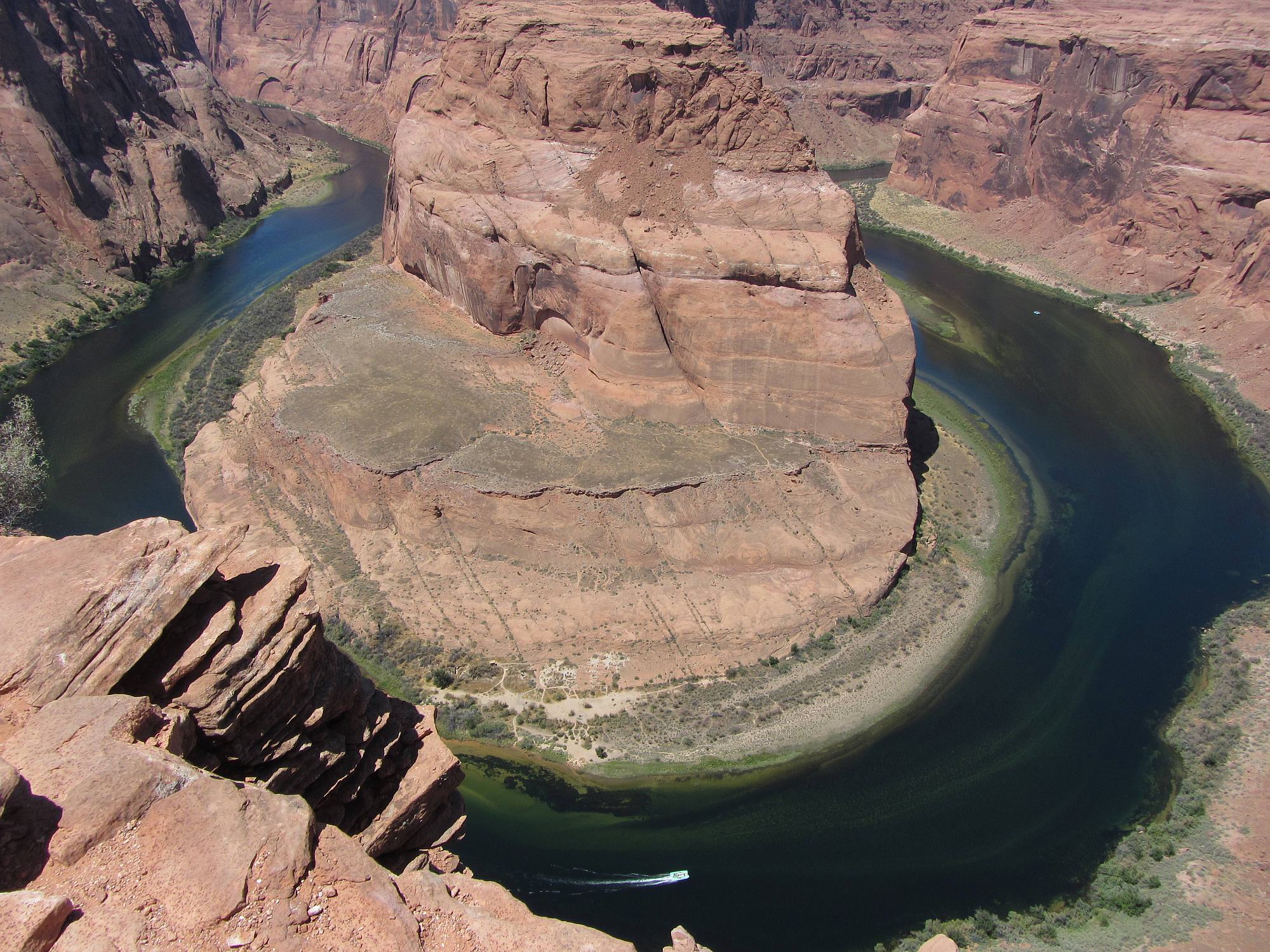 Mit Verlassen des Desert View Watchtowers verließen wir auch den Grand Canyon und fuhren weiter zum Horseshoe Bend (bzw. Glen Canyon). Wie der Name schon vermuten läßt, handelt es sich hierbei um eine hufeisenförmige Biegung des Colorados. Der Parkplatz war bei unserer Ankunft bereits nahezu voll. Nach kurzen Suchen fanden wir aber noch 2 Parkplätze. Nach dem Parken erwartete uns ein ca. viertel-stündiger Fußweg bis zum Aussichtspunkt. Die ersten Meter ging es erst einmal bergauf und auf der Kuppe des Hügels war eine Art Pavillon zu sehen, in dem sich auch viele Besucher aufhielten. Vom Parkplatz sah es so aus, als wäre da der Aussichtspunkt. Kurz vor erreichen der Kuppe realisierten wir, daß das nur etwa 1/3 des Weges war. Der 2. Teil des Weges ging leicht bergab bis zum Aussichtspunkt. Auch hier gilt, man muß es gesehen haben, da die Fotos nur einen schwachen Eindruck vermitteln können. Der Besucherandrang ist hier fast höher als beim Grand Canyon.