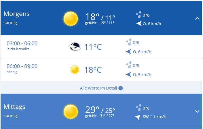 Die Wettervorhersage könnte kaum besser sein. Einige Wetterdienste melden leichte Bewölkung am Vormittag, die sich aber zum Mittag hin auflöst. Andere Wetterdienste sagen den ganzen Tag wolkenloses Wetter voraus. Egal was nun zutrifft – es ist nichts, worüber man sich ernsthaft sorgen machen müßte.