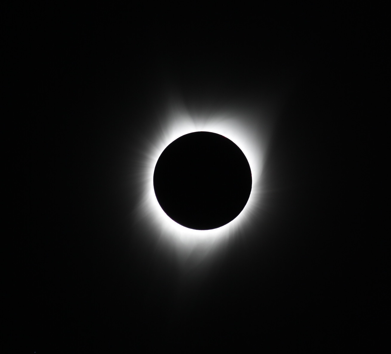 Und hier eine unbearbeitete Einzelaufnahme, die währende der Totalitätsphase entstanden ist. Aufgenommen mit ESO1000D am Scopos 66/400 (400mm Brennweite, f/6)Wie gesagt, mehr heute abend. (Also nach unserer Zeit heute abend.)