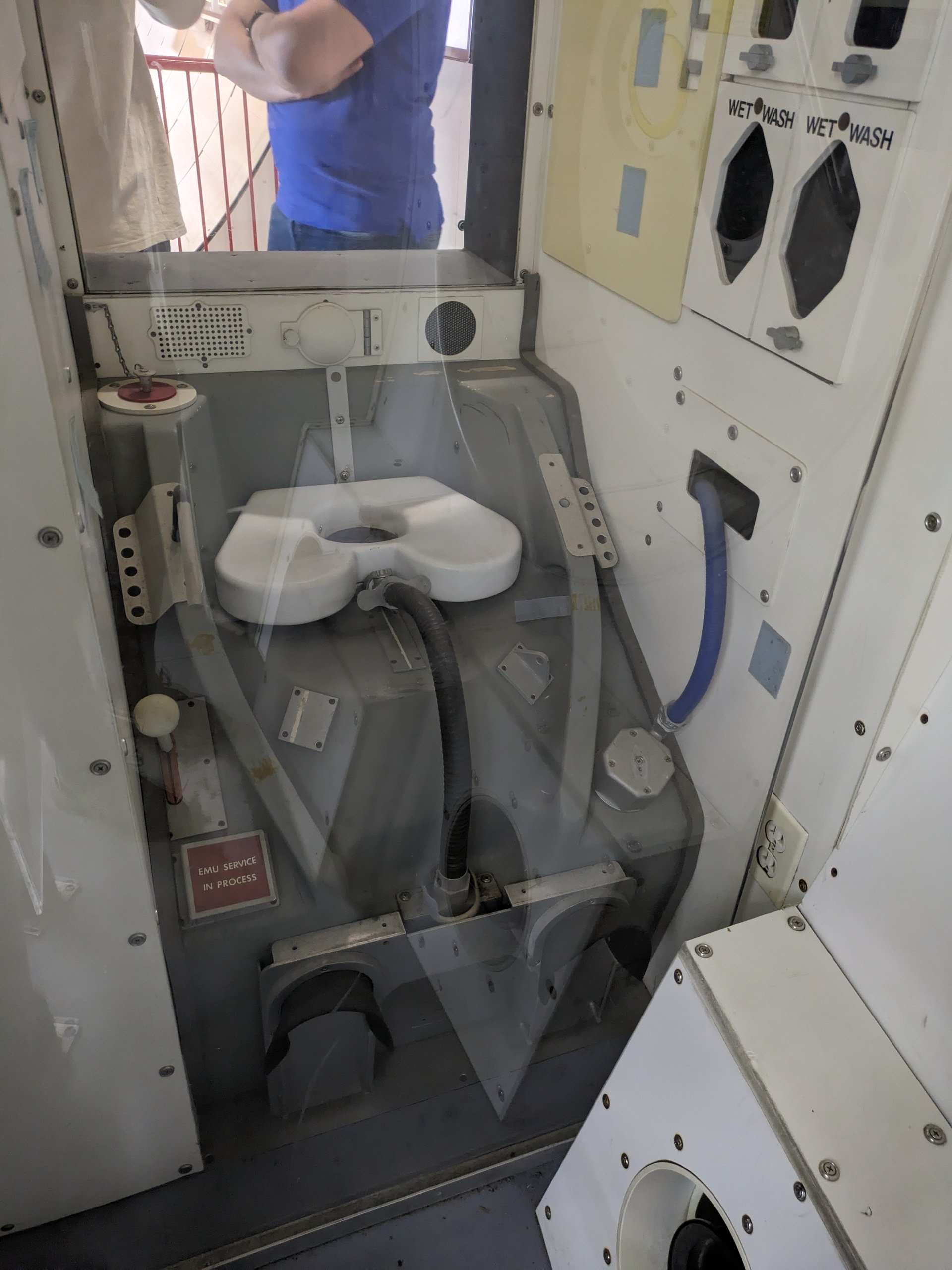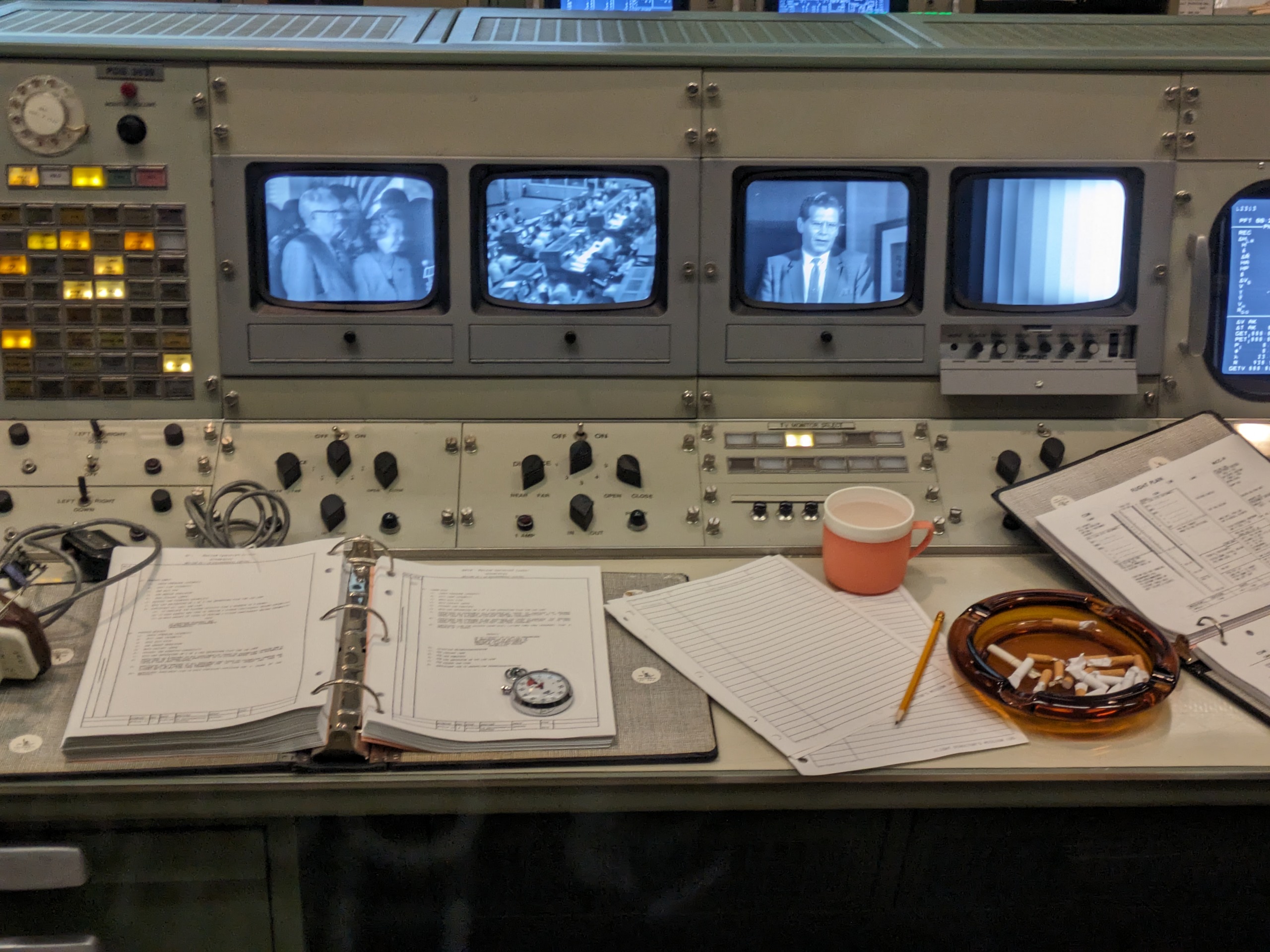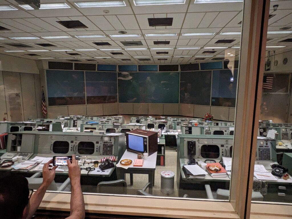 Im Historic Mission Control gab es eine Vorführung zur Landung von Apollo 11 und natürlich die ersten Schritte von Neil Armstrong auf dem Mond. Es wurde der originale Funkverkehr abgespielt und parallel die Anzeigen und Fernsehbilder gezeigt, so dass man einen ungefähren Eindruck bekam, wie es damals im Kontrollzentrum zuging. Nur eine Etage unter uns war das aktuelle Kontrollzentrum, von dem aus die Kommunikation und Koordination mit der ISS stattfindet.